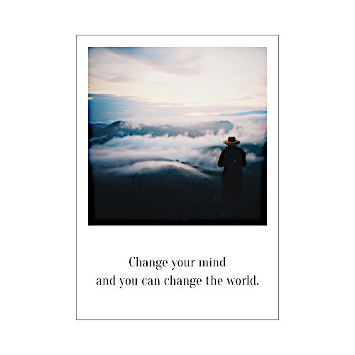 Eine Postkarte im Stil von Polaroid Bildern. Motiv: Ein Mann mit Hut steht auf dem Gipfel eines Berges und schaut auf die umliegenden Berge, die halb unter Wolken verborgen sind. Spruch: Change your mind and you can change the world Übersetzung: Ändere deine Einstellung und du kannst die Welt verändern