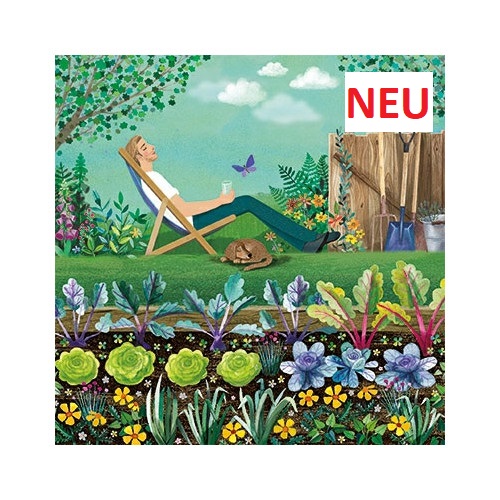 Eine quadratische Postkarte mit dem Motiv eines Mannes der im Liegestuhl in seinem Garten relaxed. Künstlerin Mila Marquis