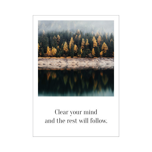 Die Postkarte Mind zeigt das Bild eines Waldes mit dem Spruch: Clear your mind and the rest will follow - Finde innere Klarheit und der Rest wird folgen