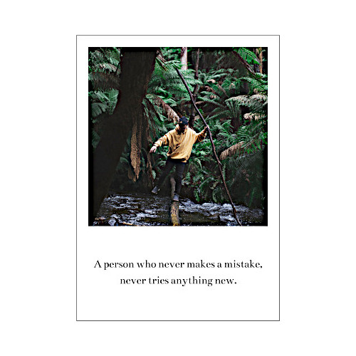 Eine Postkarte in Polaroid Stil. Motiv: Eine person balanciert auf einem dicken Seil über einen Bach im Dschungel. Spruch: A person who never makes a mistake, never tries something new Übersetzung: Eine Person, die niemals einen Fehler macht, probiert nie etwas Neues aus