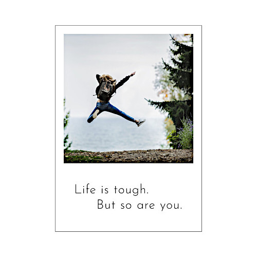 Eine Postkarte im Polaroid Stil. Motiv: Eine Frau spring durch die Luft. Spruch: Life is tough. But so are you. Übersetzung: Das Leben ist tough. Aber du bist es auch.