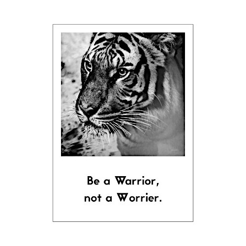 Eine Postkarte im Stil von Polaroid Bildern. Motiv: Schwarz-weiß Bild eines Kopfes eines Tigers. Spruch: Be a warrior, not a worrier Übersetzung: Sei ein Krieger, kein Grübler