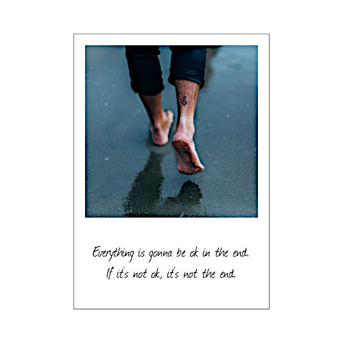 Eine Postkarte im Polaroid Stil. Motiv: Man sie die unteren Beine und Füße eines Mann, der am Meer im Wasser spazieren geht. Spruch: Everything is goind to be ok. If it is not okay, it is not the end Übersetzung: Am Ende wird alles ok sein. Wenn es nicht ok ist, dann ist es noch nicht das Ende