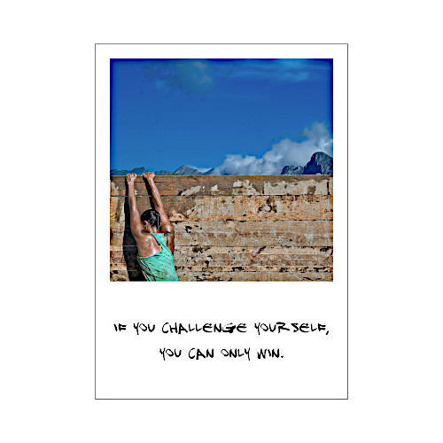 Postkarte im Polaroid Stil. Motiv: Eine Frau hält sich oben an einer Wand fest, als ob sie hinaufklettern möchte. Im Hintergrund ganz leicht Berge. Spruch: If you challenge yourself, you can only win Übersetzung: Wenn du dich selbst herausforderst, kannst du nur gewinnen