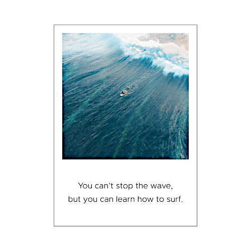 Eine Postkarte im Stil von Polaroid Bildern. Motiv: eine Wellenreiter im Meer. Spruch:You can't stop the wave, but you can learn how to surf Übersetzung: Du kannst die Welle nicht aufhalten, aber du kannst surfen lernen