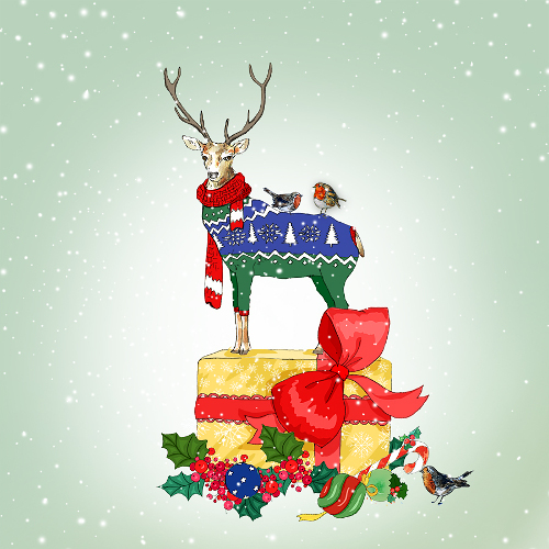 Eine quadratische Weihnachtskarte mit einem Hirsch im Pullover und Schal. Vor ihm stehen ein gelbes Paket mit roter Schleife. davor wurde eine paar Zweige eine Stechpalme und rote Beeren dekoriert.