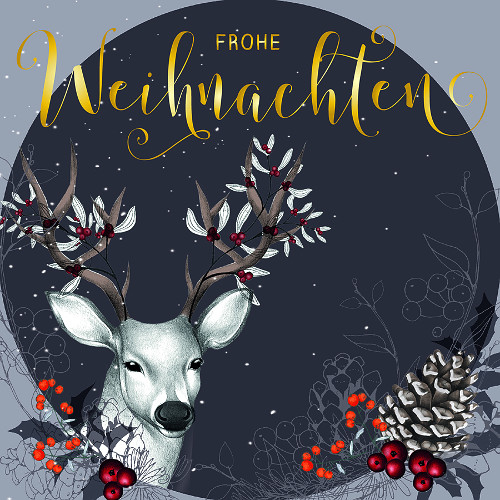 Eine quadratische Weihnachtskarte mit grau-blauem Hintergrund. Darauf ist ein Hirsch mit Weihnachtskugel im Geweih zu sehen..